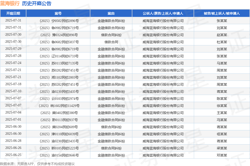 案号:(2025)冀0123民初2729号审理法院:正定县人民法院案由:借款合同纠纷当事人信息: 原告/上诉人:威海蓝海银行股份有限公司 被告/被上诉人:王某某开庭日期:2025年6月18日根据统计,近一年内以威海蓝海银行股份有限公司为当事人的历史开庭公告有231则,其中案由为“金融借款合同纠纷”的公告以147则居首,其次为“借款合同纠纷”有72则,“追偿权纠纷”有6则。历史开庭公告(前20条)如下: