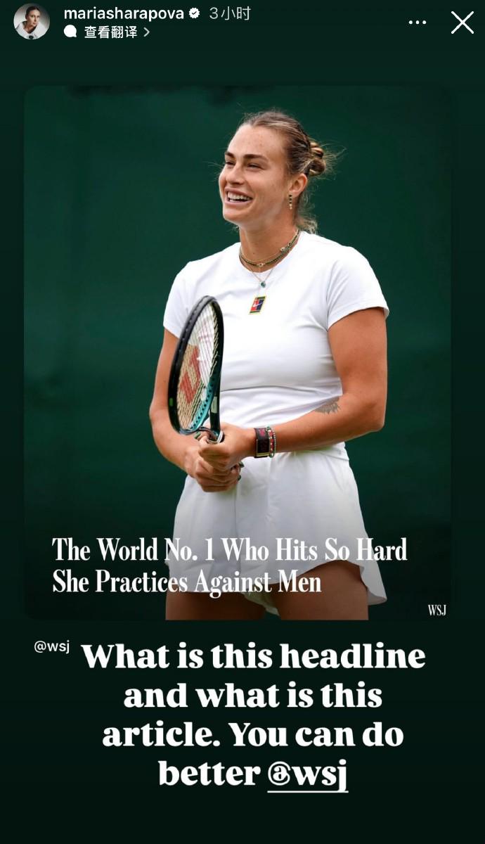 五届大满贯冠军莎拉波娃社媒为萨巴伦卡发声:这是什么标题?这是什么文章?你(该媒体)可以做得更好。
