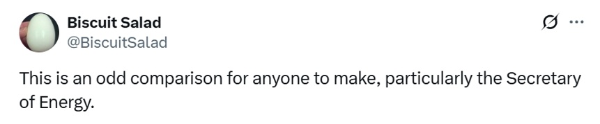 还有网友说,“对任何人来说,作出这样的比较都很奇怪,尤其是对能源部长来说。” ↓