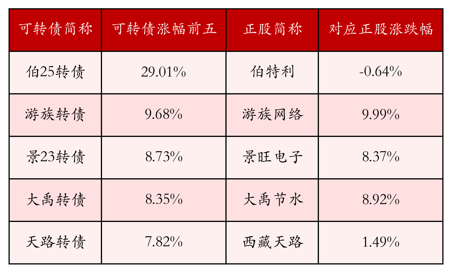 盘后数据显示,债市方面,中证转债指数收跌0.7%,报460.34,成交额为767.16亿元。可转债方面,今日共成交464只可转债,其中77只收涨,1只收平,386只收跌。具体来看,18只可转债涨幅超过2%。其中伯25转债(113696)涨29.01%,游族转债(128074)涨9.68%,景23转债(113669)涨8.73%。今日有24只可转债跌幅超2%,亿田转债(123235)跌5.91%,平煤转债(113066)跌5.34%,文科转债(128127)跌3.7%。存在交易量的可转债所对应的正股中,220只收涨,13只收平,231只收跌。具体来看,23只可转债对应正股涨幅超过5%,其中,科华生物(002022)涨停,收涨10.01%;游族网络(002174)涨停,收涨9.99%。同时所对应的可转债:科华转债(128124)同涨3.06%;游族转债(128074)同涨9.68%。今日有5只可转债对应正股跌幅超过5%,没有正股跌停。